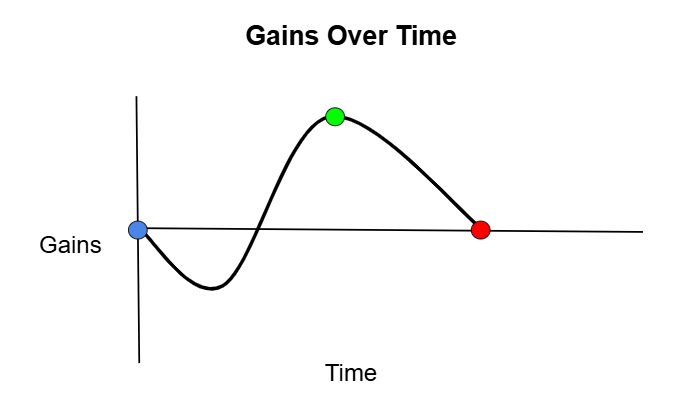 On this graph, the blue dot represents a workout. In the time directly after a workout we have muscle breakdown which leads to decreased performance. Then our muscles build themselves back up and, assuming our nutrition and rest are decent, they surpass their starting point and build bigger and stronger (green dot). The gains then slowly drop back down to the baseline (red dot).